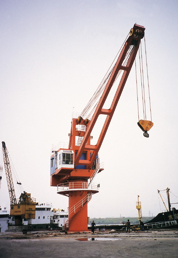 吊鉤型固定式港口起重機采用單臂架、鋼絲繩變幅和四點接觸球式回轉(zhuǎn)支承結構,并設置滑輪補償裝置,可使貨物近似水平移動,實現(xiàn)全幅度帶載變幅,變幅速度較快,作業(yè)效率高,可360°全回轉(zhuǎn)。本機具有結構新穎,傳動平穩(wěn),效率高,操作方便,故障率低等特點。根據(jù)用戶需求,可采用變頻控制,使用各機構運轉(zhuǎn)更平穩(wěn)可靠