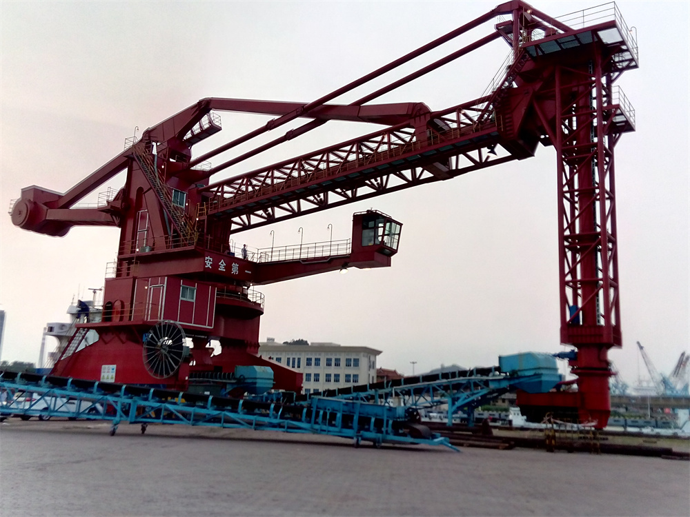 固定旋轉(zhuǎn)式:安裝在碼頭岸邊固定基礎(chǔ)上,依靠水平臂繞回轉(zhuǎn)塔旋轉(zhuǎn)與垂直取料器提取料。