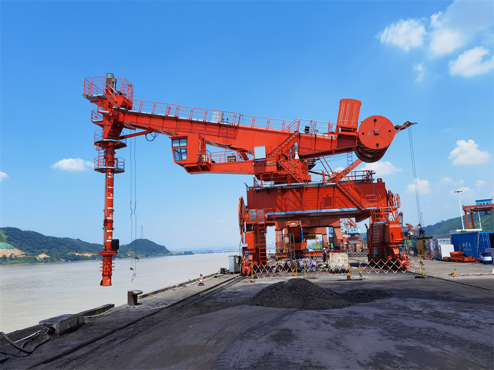 螺旋式卸船機屬于連續(xù)卸船機,由以下部分所組成:沿順岸軌道移動的門架及行走小車;支承在門架上并繞中心旋轉(zhuǎn)的平臺;由變幅油缸驅(qū)動可上下俯仰的水平伸臂及固定其上的水平螺旋輸送機;由擺動油缸驅(qū)動可繞水平伸臂端部前后擺動的豎直臂及固接其上的垂直螺旋輸送機;安裝在垂直螺旋下端的松料螺旋及取料裝置;位于門架上旋轉(zhuǎn)塔架下方的水平螺旋輸送機;碼頭后方帶式輸送機等。